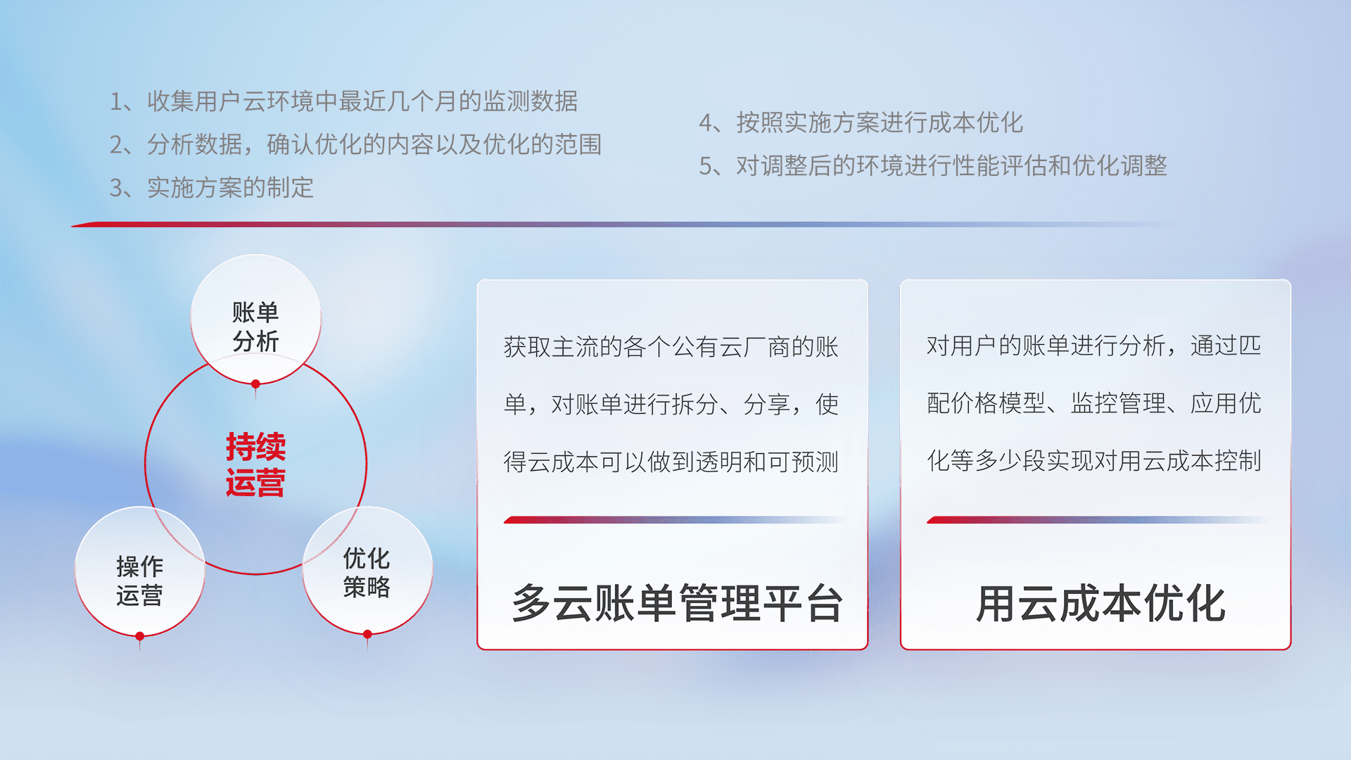 通过多云纳管,,,以统一的资源数据模型把客户的云资源进行抽象和封装,,,,进而实现对多云资源的统一操作,,保障云资源管理的可靠性、、、、稳定性与可用性。。。量身定制化运维内容,,,配置、、开发运维、、、补丁管理、、、、备份、、监控、、认证和访问管理、、、审计和日常巡检等,,,,保障在用云过程中的可靠度,,,稳定度以及高可用率。。。